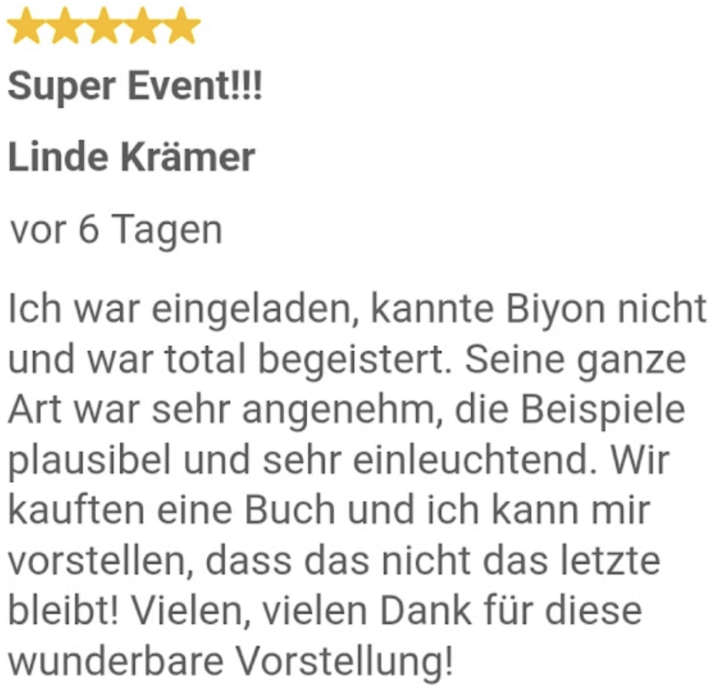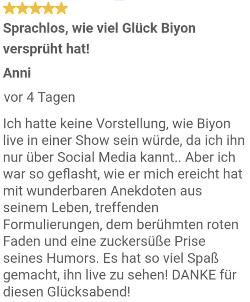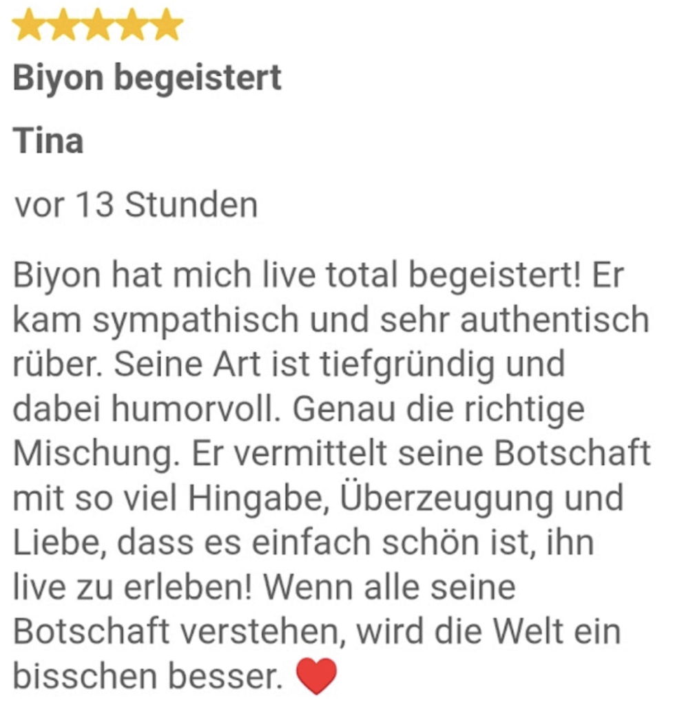 Ein sehr schöner Abend, der viele Emotionen freigesetzt hat. Anstoss Dinge im eigenen Leben zu hinterfragen. Biyon hat das wundervolle Talent ungezwungen auf Menschen zuzugehen und ihnen zu vermitteln, wie wertvoll und einzigartig sie sind und das sie es verdienen glücklich zu sein🫶😊. Danke für diesen schönen Abend 🙂💝